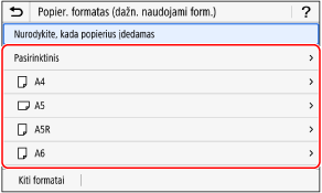 Pasirinkite popieriaus formatą, kuri norite užregistruoti.