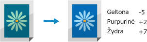Galite koreguoti geltonos, purpurinės, žydros ir juodos spalvos lygius, kad kopijos spalvos labiau atitiktų originalą arba būtų aiškesnės nei originalo.