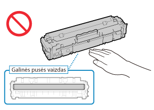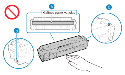 Nesubraižykite būgno paviršiaus (  ) ir nelaikykite jo prieš šviesą. Taip pat nelieskite elektros kontaktų (  ) arba dažomųjų miltelių kasetės atminties (  ).