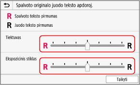 Nuskaitydami spalvotus originalus, galite atlikti koregavimus, pirmenybę suteikdami tamsių spalvų teksto (spalvotam tekstui) atkūrimui arba padaryti juodą tekstą lengviau matomą.