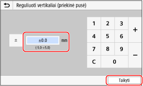Nurodykite koregavimo kryptį naudodami „+“ ir „-“, tada nurodykite koregavimo plotį 0,1 mm padalomis.
