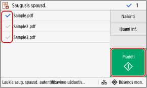 Jei aukščiau pateiktame 2 veiksme pasirinksite kelis saugiųjų duomenų failus, bus atspausdinti tik saugieji duomenys, atitinkantys įvestą PIN kodą arba slaptažodį.
