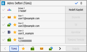 Hedef türleri aşağıdaki sembollerle gösterilir ve ad, e-posta adresi ve faks numarası gibi hedef bilgileri görüntülenir: