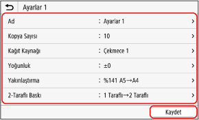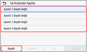 Amacınıza uygun ayarları, ayrıca tarama, faks ve kopyalama işlevleri için "Favori Ayarlar" olarak geri çağırmak istediğiniz ayarları kaydedebilirsiniz.