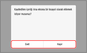 [Hayır] öğesini seçtiğinizde Favori Ayar kaydedilir ancak bir kısayol düğmesi eklenmez. [Ana Ekran] kısmına daha sonra bir kısayol düğmesi ekleyebilirsiniz.