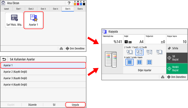 Kumanda panelindeki [Ana Ekran] kısmına eklenen kısayol düğmelerini ve her bir işlevin ekranını kullanarak hızlı işlem için kaydedilen ayarları çağırabilirsiniz. Ayrıca, ayarları gerektiği gibi çağırdıktan sonra da değiştirebilirsiniz.
