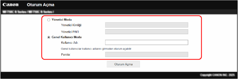 Yönetici Kimliği'nden farklı bir Departman Kimliği girildiğinde, Genel Kullanıcı Modu ile oturum açmanız gerekir.
