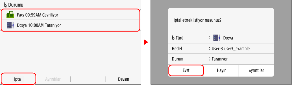 İş listesi ekranı görüntülenirse iptal edilecek işi seçin ve [İptal]