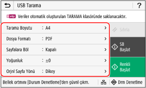 Bu ayarlar, taranan verileri bir USB bellek cihazına kaydetmeye imkan tanır. Taranan Verileri Bir USB Bellek Cihazına Kaydetme Hazırlığı