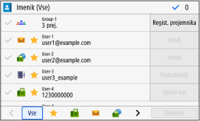 Ti so prikazani na desni strani zaslona. Pritisnite, da registrirate, uredite ali izbrišete prejemnika ali da določite prejemnika, kateremu želite poslati ali kjer želite shraniti podatke.
