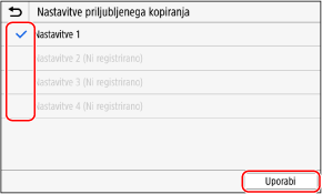 Potrdite potrditvena polja nastavitev, ki jih želite dodeliti kot bližnjične gumbe, in pritisnite [Uporabi].