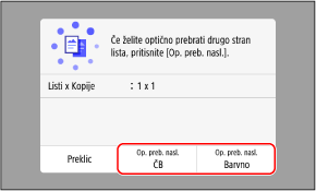 Zadnjo stran lahko kopirate v drugačnem barvnem načinu (črno-belem ali barvnem) kot sprednjo stran. Če želite kopirati hrbtno stran v črno-beli tehniki, pritisnite [Op. preb. nasl. ČB]. Za barvno kopiranje pritisnite [Op. preb. nasl. Barvno].
