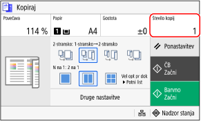Pritisnite [Število kopij], s številčnimi tipkami vnesite število kopij, nato pa pritisnite [Zapri].