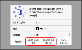 Če je prikazano [Op. preb. nasl.], postavite naslednji potni list na kopirano steklo in pritisnite [Op. preb. nasl. ČB] ali [Op. preb. nasl. Barvno].