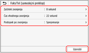 Nastavite čas zvonjenja in dejanje ob prejemu faksa ter pritisnite [Uporabi].