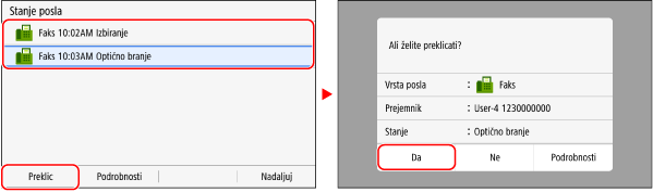 Če je prikazan zaslon s seznamom poslov, izberite posel, ki ga želite preklicati, in pritisnite [Preklic]