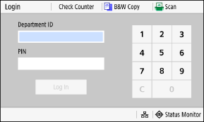 When Department ID Management is set up, the following login screen is displayed. Enter the Department ID to log in. If a PIN is set, enter the PIN.