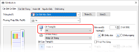 Trong [Cỡ Trang] trên thẻ [Cài Đặt Cơ Bản], chọn khổ giấy của tài liệu.