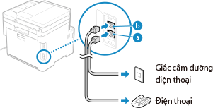5 | Kết nối dây điện thoại được cung cấp với giắc cắm đường dây điện thoại ( ) trên máy và đầu nối đường dây điện thoại trên tường.![]() Kết nối điện thoại với giắc cắm điện thoại bên ngoài ( ) trên máy.Khi kết nối điện thoại có chức năng fax, đảm bảo đã tắt cài đặt nhận fax tự động trên điện thoại. Tùy thuộc vào loại điện thoại được kết nối với máy, máy có thể không gửi hoặc nhận fax đúng cách. |