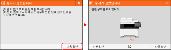 오류가 발생하거나 기기에 용지가 없거나 토너 카트리지에 토너가 없으면 화면에 메시지가 표시됩니다.
