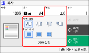 기본 복사 설정 외에도 기기에는 원고와 목적에 따라 설정할 수 있는 양면 복사, 이미지 품질 조정 및 기타 설정이 있습니다. 복사 화면을 사용하여 이러한 설정을 구성합니다.