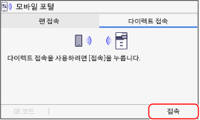 기기에서 직접 연결 기능을 활성화하는 등의 준비를 합니다. 직접 연결 준비QR 코드를 스캔하여 연결하려면 모바일 장치에 Canon PRINT를 설치합니다. |
