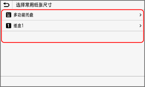 纸张设置屏幕显示已注册的常用纸张尺寸。 如果显示未使用的纸张尺寸,可以为每个纸张来源隐藏这些尺寸,以方便选择纸张尺寸。
