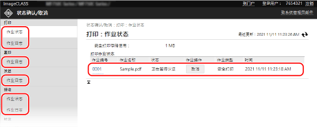 单击暂停打印和安全打印的 [作业编号],可显示打印详细信息和查看用户名及打印的张数。