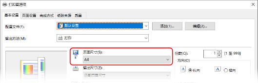 在 [基本设置] 选项卡上的 [页面尺寸] 中,选择文档的纸张尺寸。