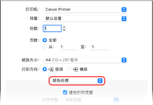 从打印选项弹出菜单中,选择 [纸张处理]。