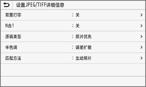 要显示此屏幕,请在存储介质打印设置屏幕上按下 [设置JPEG/TIFF详细]。