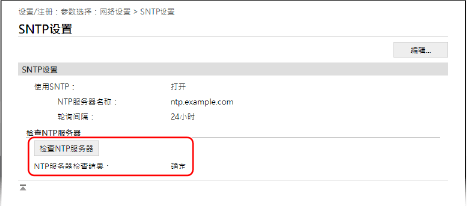 以管理员模式登录远程用户界面 单击 [设置/注册] [网络设置] [SNTP设置] [检查NTP服务器]。