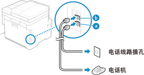 5 | 将随附的电话线连接到机器上的电话线路插口 ( ) 和墙壁上的电话线路接口。![]() 将电话连接到机器上的外部电话插口 ( )。连接具有传真功能的电话时,务必禁用电话上的传真自动接收设置。 根据所连接的电话类型,机器可能无法正确发送或接收传真。 |