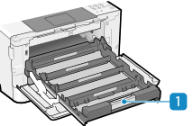 トナーカートリッジをセットします。各スロットに奥から手前に向かって、Y(イエロー)、M(マゼンタ)、C(シアン)、K(ブラック)の各トナーカートリッジをセットします。