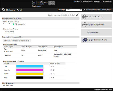Lorsque vous vous connectez à l'interface utilisateur distante, la page Portail (page d'accueil de l'interface utilisateur distante) s'affiche. Depuis cette page, vous pouvez vérifier l'état d'utilisation de l'appareil, afficher diverses informations et changer les paramètres au moyen de boutons.
