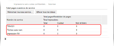 Vous pouvez afficher le nombre de pages imprimées avec chaque ID de service lorsque la gestion par ID de service est activée.