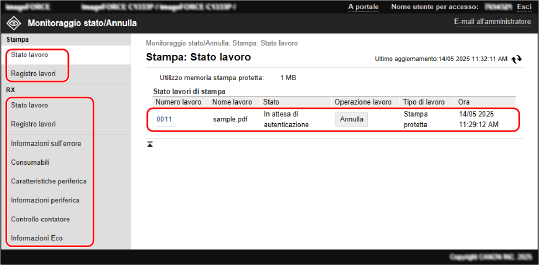 Fare clic su [Numero lavoro] per le stampe messe in pausa e le stampe protette per visualizzare i dettagli di stampa, il nome utente e il numero di fogli stampati.