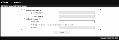 Per utilizzare la IU remota, inserire l'indirizzo IP della macchina in un browser web su un computer e accedere in Modo amministratore o utente generico. Le funzioni disponibili con la IU remota variano a seconda della modalità con cui si accede.