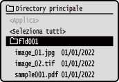 Schermata [Scher. principale]Vengono visualizzati i file e le cartelle presenti nel dispositivo di memoria USB.