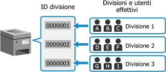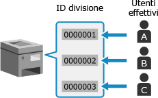 La gestione ID reparto è una funzione per gestire gli utenti e i gruppi assegnando un ID reparto a ciascun utente o gruppo.