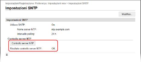 Verifica della comunicazione con il server NTP o SNTPTestare la comunicazione attenendosi alla procedura indicata di seguito: se la macchina comunica correttamente con il server, viene visualizzato [OK] in [Risultato controllo server NTP]. Accedere alla IU remota in Modo amministratore  fare clic su [Impostazioni/Registrazione]  [Impostazioni rete]  [Impostazioni SNTP]  [Controllo server NTP]. |