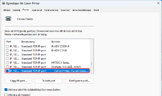 På fliken [Portar] ska du kontrollera att kryssrutan [Aktivera stöd för dubbelriktad kommunikation] markerad.