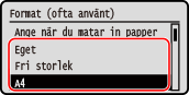 När papper fylls på i universalfacket visas som standard skärmen för att ange pappersformat och papperstyp på kontrollpanelen.
