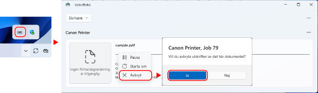 Om ovanstående skärm inte visas dubbelklickar du på skrivarikonen i Windows meddelandefält och väljer dokumentet som ska avbrytas. Klicka sedan på