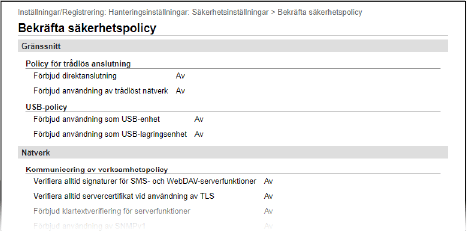 Du kan kontrollera inställningarna för säkerhetspolicyn och hur de används. Det gör du med fjärranvändargränssnittet på skärmen [Bekräfta säkerhetspolicy].