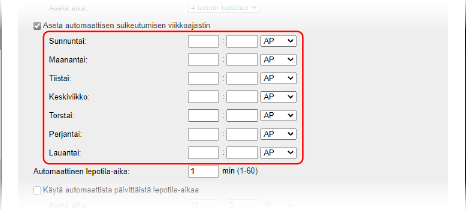 Valitse [Aseta automaattisen sulkeutumisen viikkoajastin] -valintaruutu.