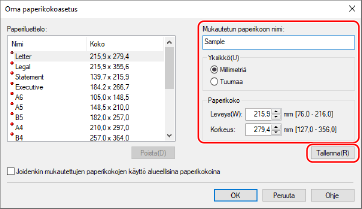 Syötä mukautetun paperikoon nimi ja paperin nimi ja napsauta [Tallenna].