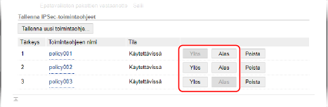 Aseta prioriteetti napsauttamalla käytännön nimen oikealla puolella [Ylös] tai [Alas]. Korkeamman tason käytännöt ovat sovelluksessa etusijalla IPSec-tiedonsiirtoon nähden.