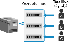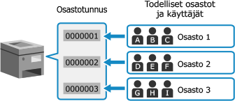 Määritä osastotunnuksia käyttäjille ja ryhmille käyttöympäristön ja -tarkoituksen mukaan. Lisäksi kun osastotunnukselle asetetaan PIN-koodi, voidaan estää luvaton pääsy ja ottaa käyttöön tiukempi hallinta.