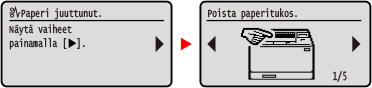 Älä poista tukkeutunutta paperia laitteesta väkisin.Paperin poistaminen väkisin voi aiheuttaa vammoja tai vahingoittaa laitteen osia. Jos et voi poistaa paperia, ota yhteyttä myynti- tai huoltoedustajaan. Jos ongelma ei poistu Kun kaikki paperitukokset on poistettuPoista välittömästi kätesi laitteesta, jotta vaatteet tai kädet eivät tartu rulliin. |